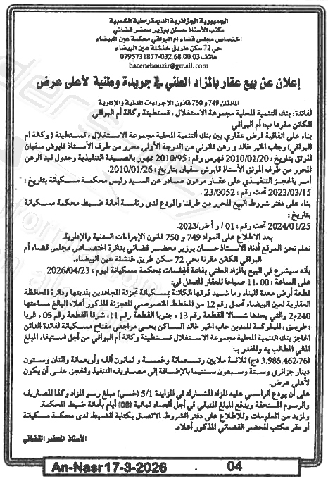 Il sera procédé à la vente au plus offrant et dernier enchérisseur le :