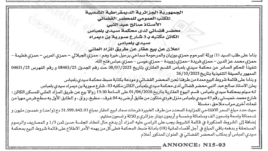 Il sera procédé à la vente au plus offrant et dernier enchérisseur le :