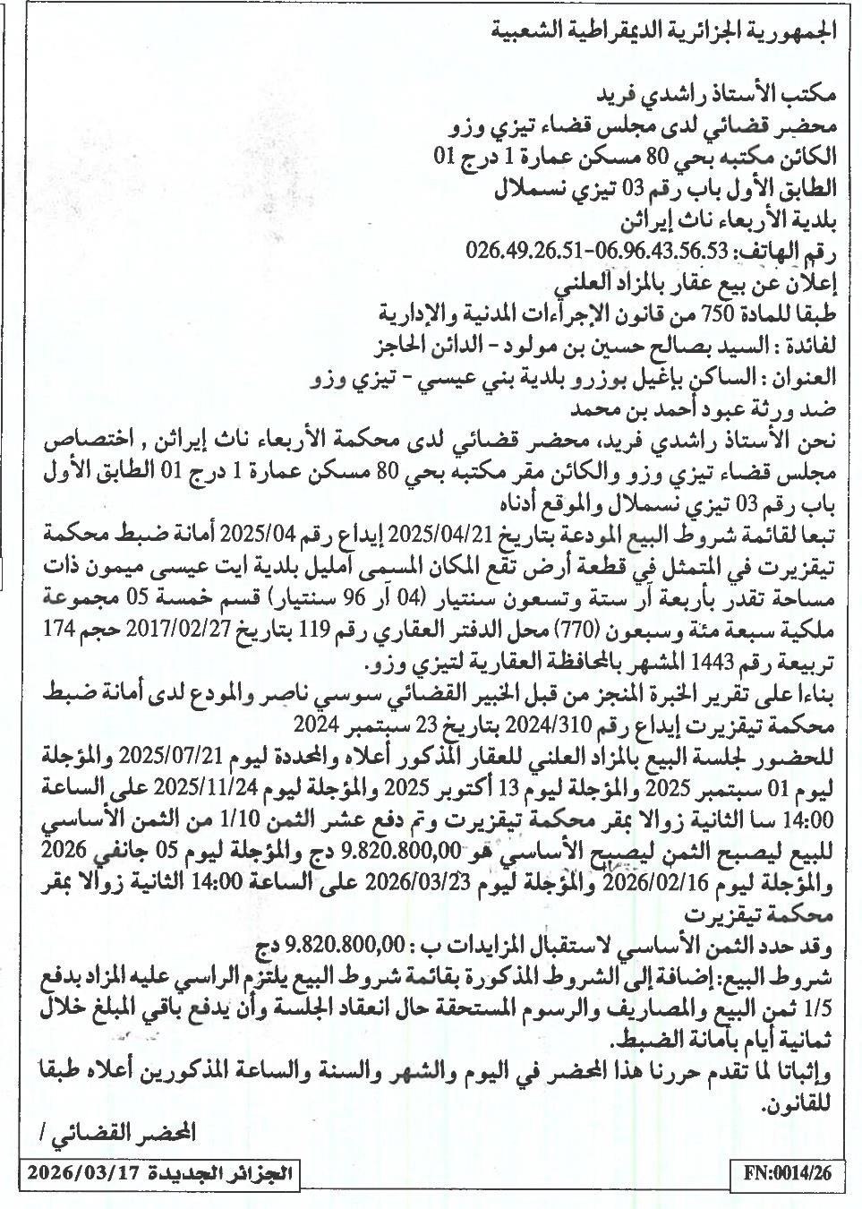 Il sera procédé à la vente au plus offrant et dernier enchérisseur le :