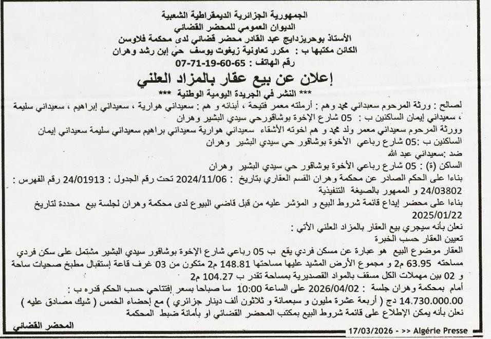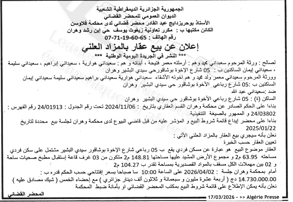 Il sera procédé à la vente au plus offrant et dernier enchérisseur le :