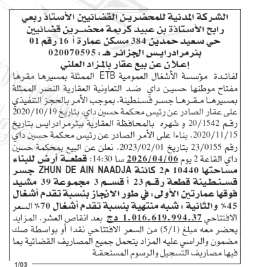 Il sera procédé à la vente au plus offrant et dernier enchérisseur le :