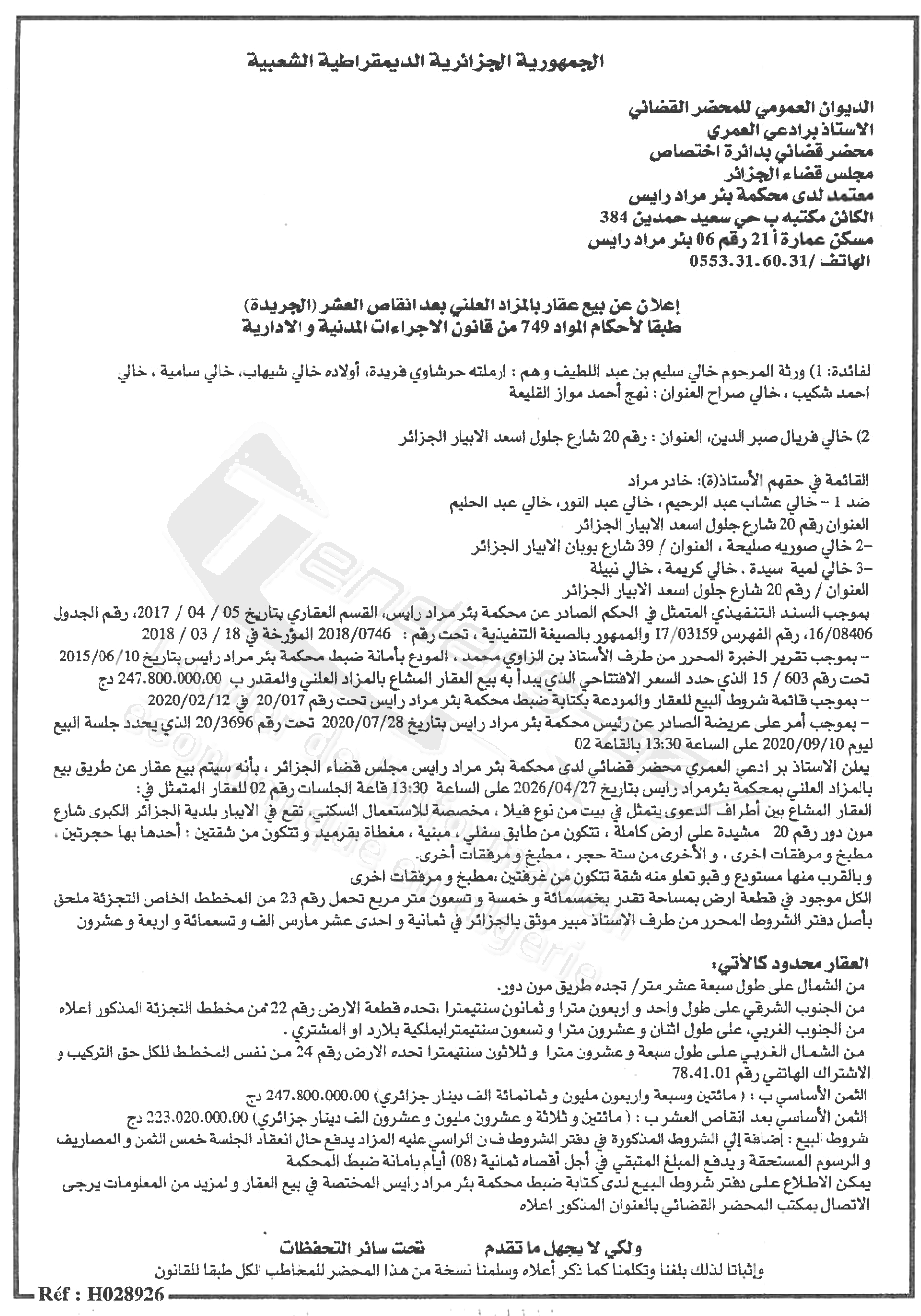 Il sera procédé à la vente au plus offrant et dernier enchérisseur le :