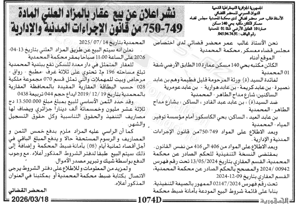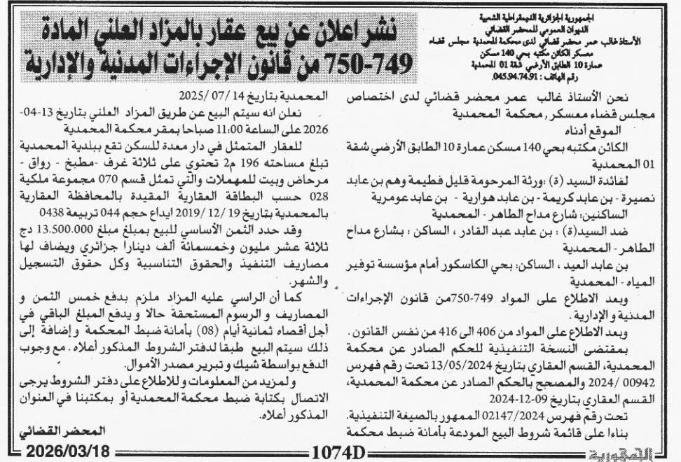 Il sera procédé à la vente au plus offrant et dernier enchérisseur le : 25/03/2026';